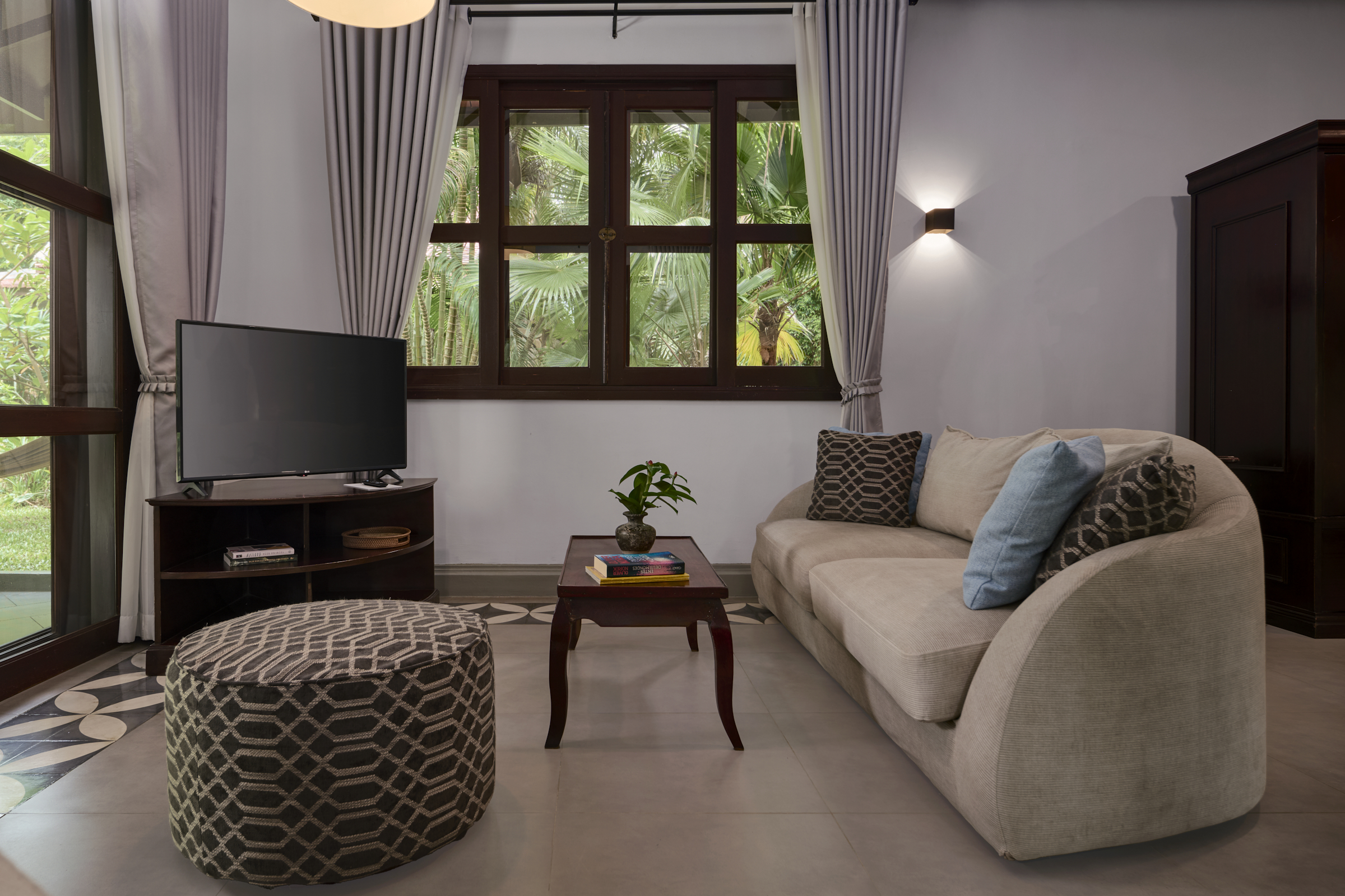 The king-size four-poster bed with a pocket coil pillow-top mattress ensures restful sleep, while the living area includes a sofa, a stylish desk, and direct access to a private terrace surrounded by lush tropical gardens. This room can also accommodate one extra bed, making it flexible for small families or additional guests.