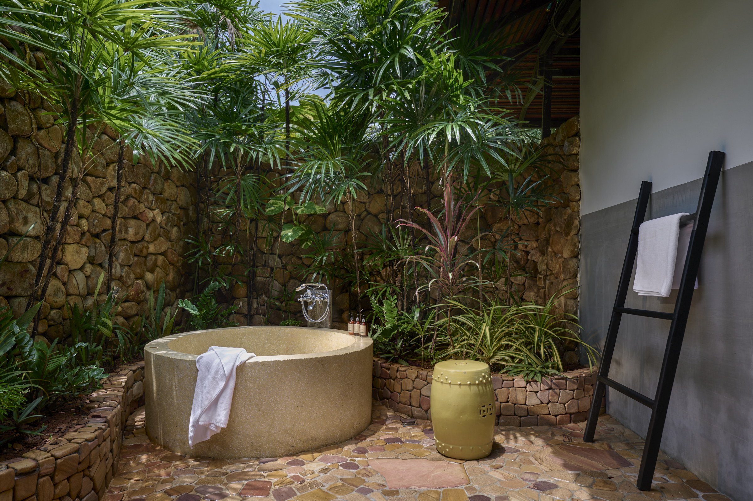 Step into your expansive bathroom featuring a deep outdoor bathtub, a rain shower, and a traditional Khmer shower, all surrounded by greenery for a spa-like experience. Bathroom amenities include Organic Bathroom Products—shampoo, conditioner, shower gel, and hand gel made in Cambodia—plus biodegradable essentials such as toothbrush, comb, and razor. Spa-style robes and slippers complete the indulgent experience.